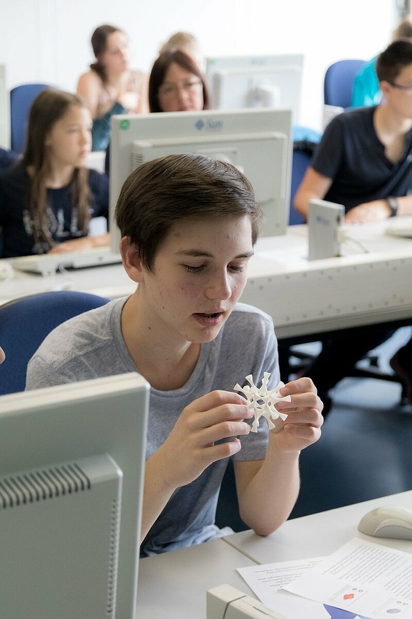 The workshop “IMAGINARY. Through the Eyes of Mathematics” by Dr. Christian Eder uses materials from the IMAGINARY “Entdeckerbox” (exploration box). Mathematical games invite participants to explore and experiment. The “Entdeckerbox” contains a collection of ideas, programs, films, and images that offer many building blocks to combine and explore individually or in groups.